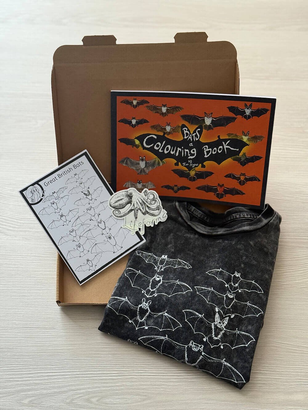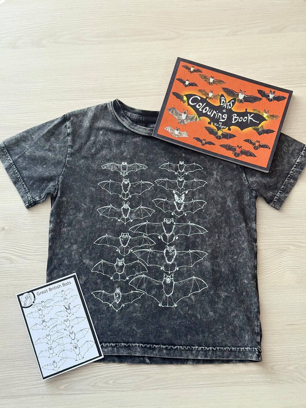 The boxed set includes the Bat T-shirt, info Leaflet and Bat Colouring Book. Bats are fascinating creatures and are a great way to nurture a love of nature in children