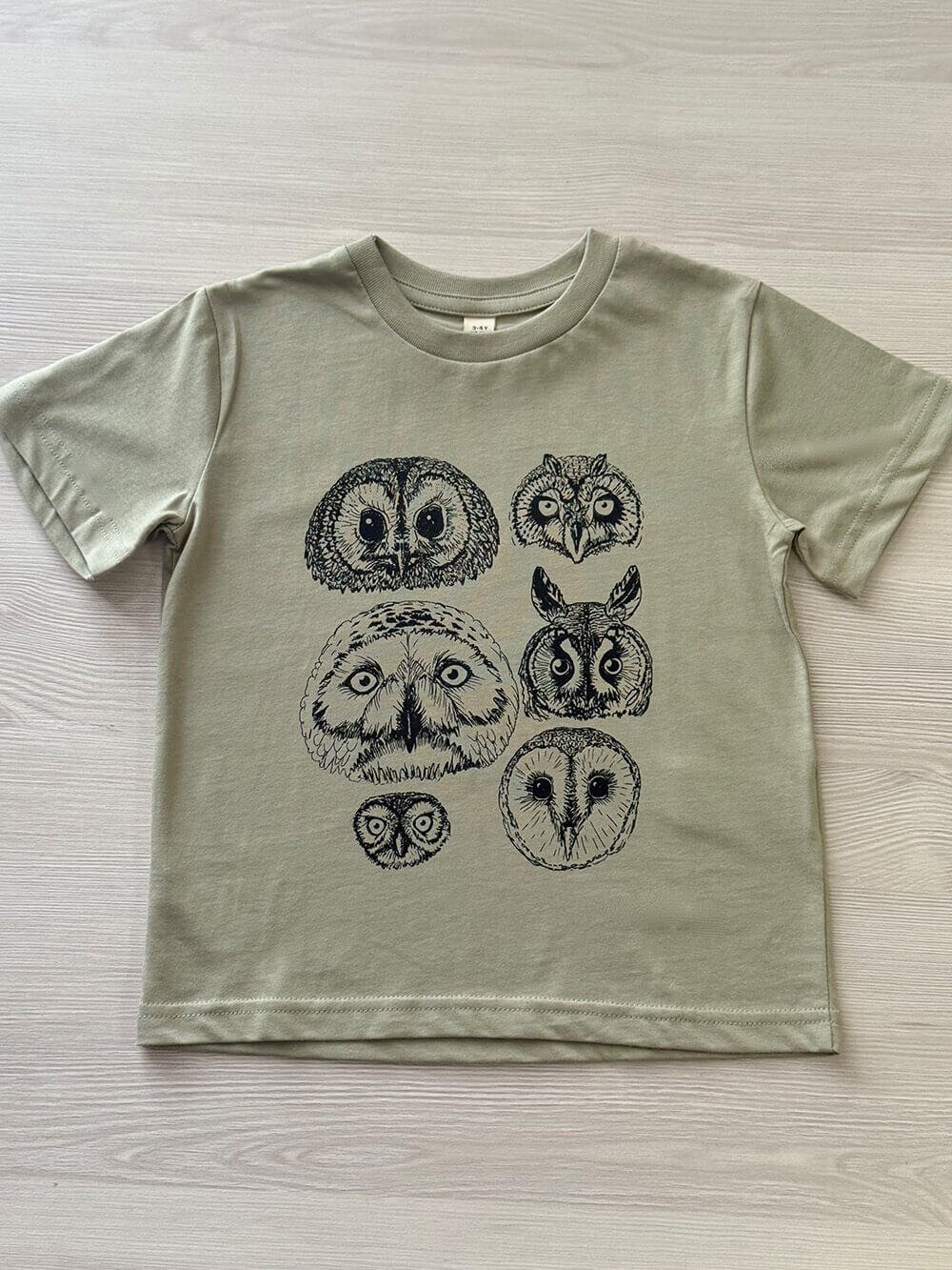 The children’s owl t-shirt will be printed in black ink onto a comfortably soft light olive green organic cotton t-shirt.