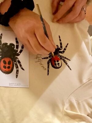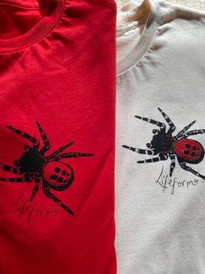 You can choose to have your  spider printed in black ink onto a natural or red T-shirt, or for extra detail you can choose to have added red, hand painted detail, on the image on the natural T-shirt this is a full homage to the male spider.